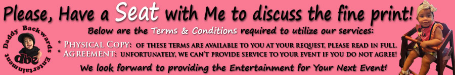 15.2 Client acknowledges and fully understands that Daddy Backwards Entertainment does not represent or provide trademarked/copyrighted characters or costumes, we only use generic mascots and costumes. Any resemblance to nationally known characters is strictly coincidental and unintentional. Should you require a copyrighted or trademarked character, we encourage you to contact the company/copyright holder for your specific targeted character. We will only accept bookings from individuals who agree to these terms.